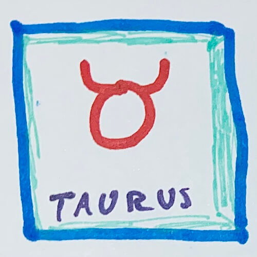 Aries, Ram’s Horns, red.Mars. Taurus, Bull’s Head & Horns, earthen brown.