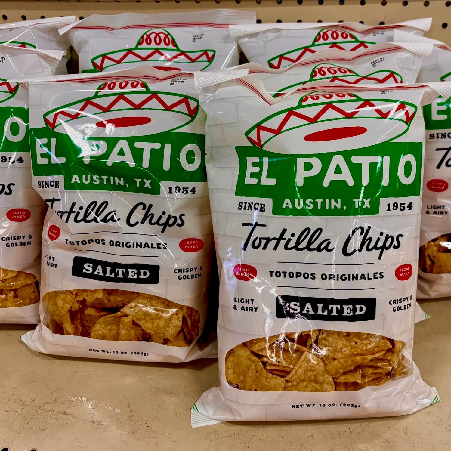 Passing through one of the big HEB (grocery store), I noticed an end cap near the door, filled with day-old breads and El Patio branded tortilla chips.